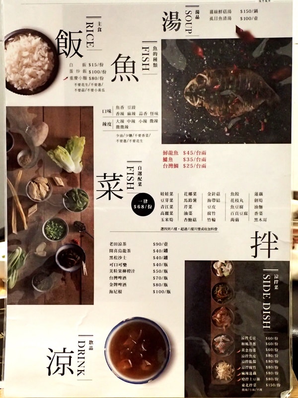 ▲菜單部份~請先挑選魚種~再選擇辣度及口味~如有小朋友可先告知店家~就能客製化不辣的口味~另有主食.湯品.配菜.涼拌菜.飲品等品項供選擇~